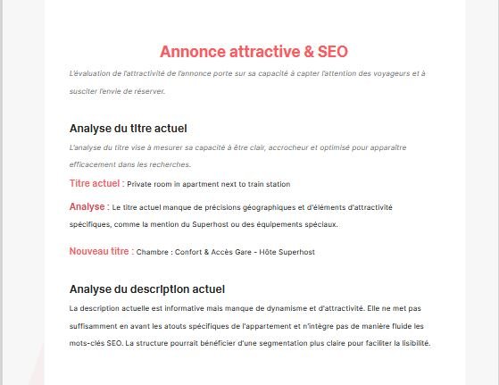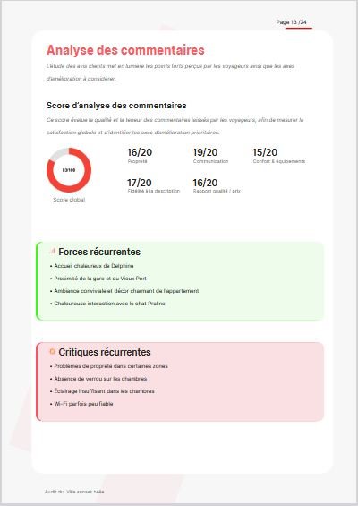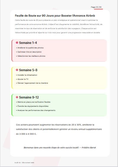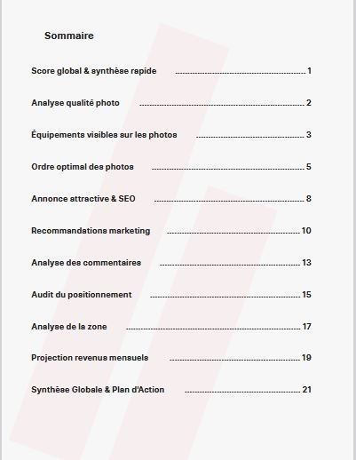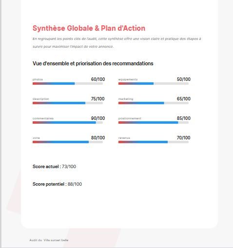 Recevez votre audit complet en PDF, clair et détaillé, directement dans votre boîte mail — sans accès à votre compte Airbnb.